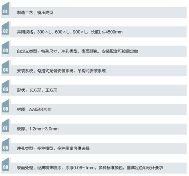 搭鋁單板天花板面平整,一般為單向平行龍骨勾搭式結構,板與板之間的拼接時通過龍骨有次序搭折在一起的,板邊獨特的勾搭設計,能很好的控制板與板之間的活動性,從而確保了板與板之間的縫隙風嚴密平整拼縫細密,棱線分明,不同寬度可實現多種組合。