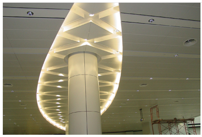 暗架天花板以優質鋁合金板材為基材,面板均采用我公司專業的平整拉伸和模壓成形等加工工藝處理成型,具有加工精度高、外形穩定,表面平整度高等特點。暗架天花板板面平整,棱線分明,拼縫細密,吊頂系統體現出整齊、大方、富貴高雅、視野開闊的外觀效果。暗架天花板具備阻燃、防腐、防潮的優點,而且裝拆方便,每件板均可獨立拆裝,方便施工和維護。如需調換和清潔吊頂面板時,可用磁性吸盤或專用拆板器快速取板,也可在穿孔板背面覆加一層吸音面紙或黑色阻燃棉布,能夠達到一定的吸音標準。